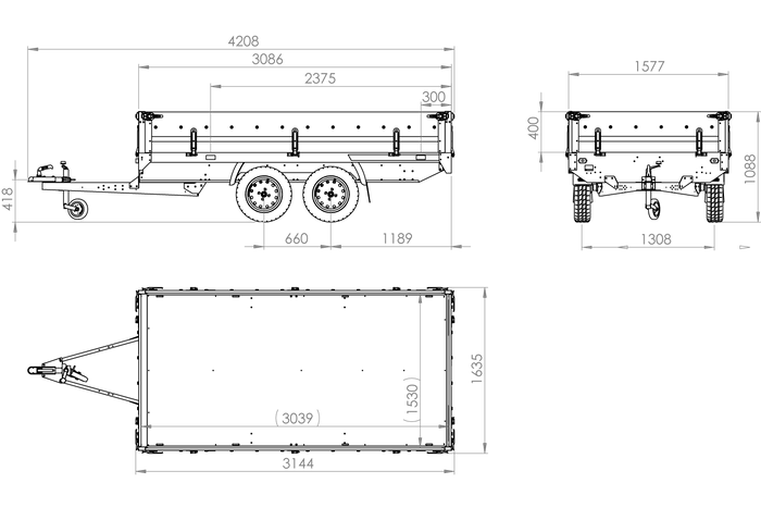 <div>2-Achs-Anhänger mit einer Transportfläche von 304×153 cm. Zulässiges Gesamtgewicht von 400 bis 750 kg. Zwei ungebremste Achsen. Vollständig verzinkt.</div>